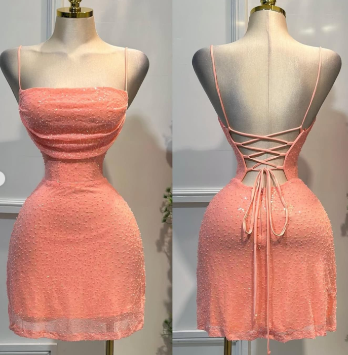 Evafashion Spaghetti Strap Sheath Tulle Beaded Homecoming Dresses, Coral Short Backless Prom Dress HZ1024