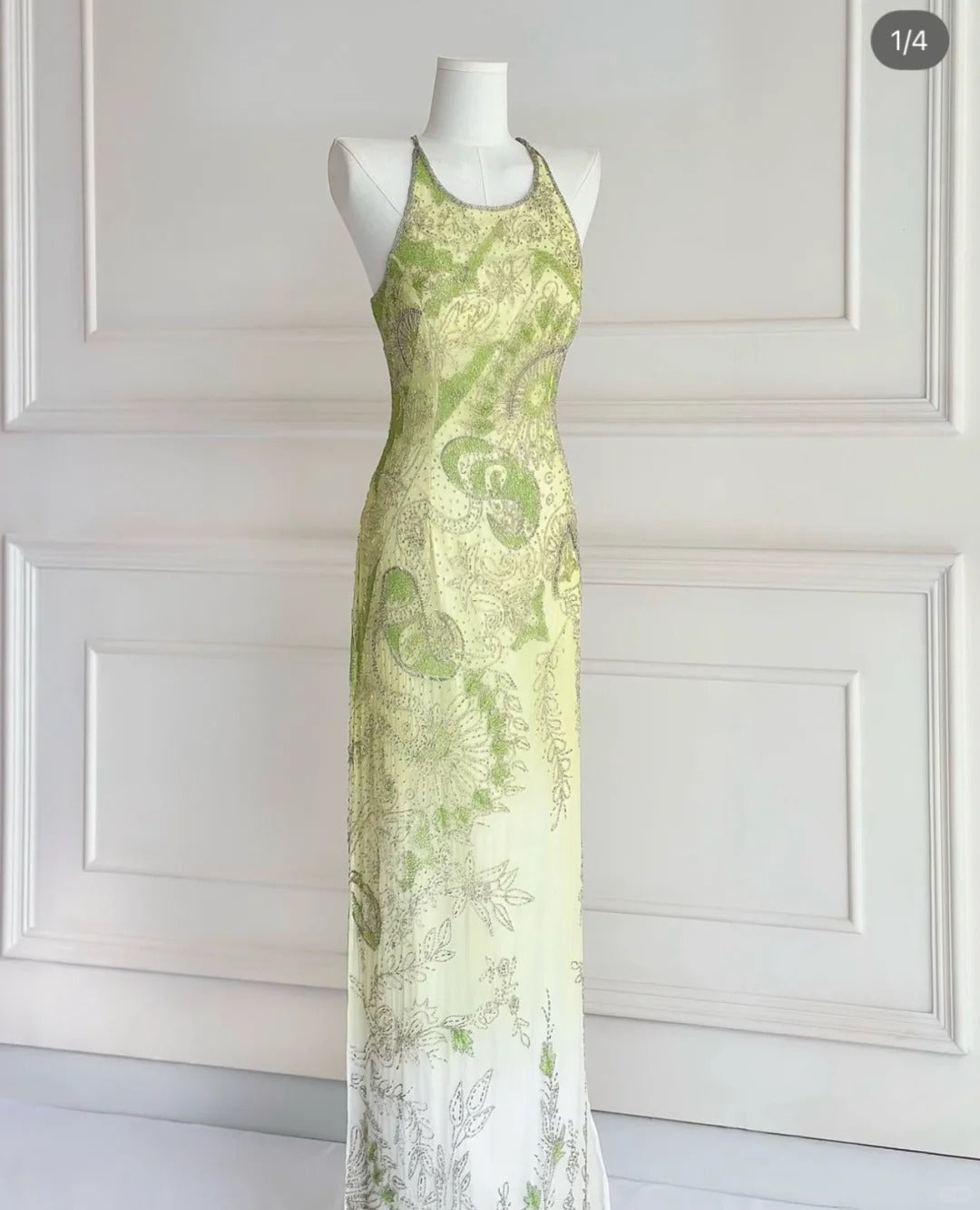 Evafashion Green Sheath Long Prom Dresses Elegant Beaded Chiffon Formal Dress Sleeveless Round Neck Evening Dress HZ1024
