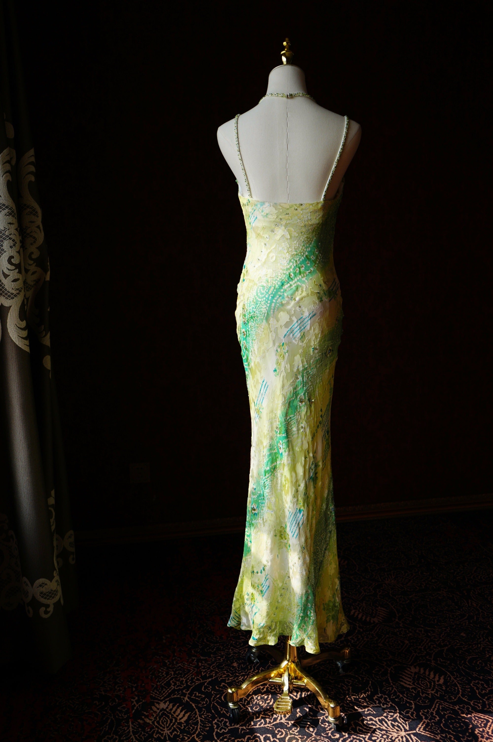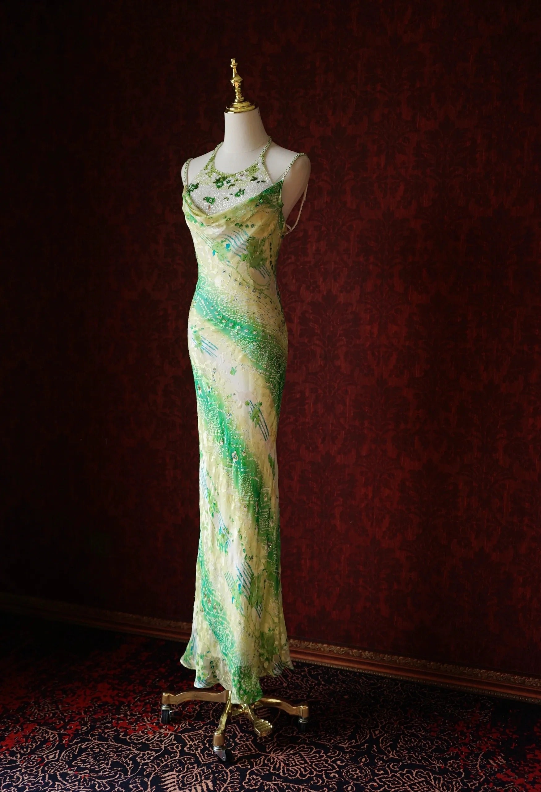 Evafashion Green Sheath Spaghetti Strap Floral Chiffon Long Prom Dress Beaded Formal Evening Dress Wedding Guest Dress HZ1024