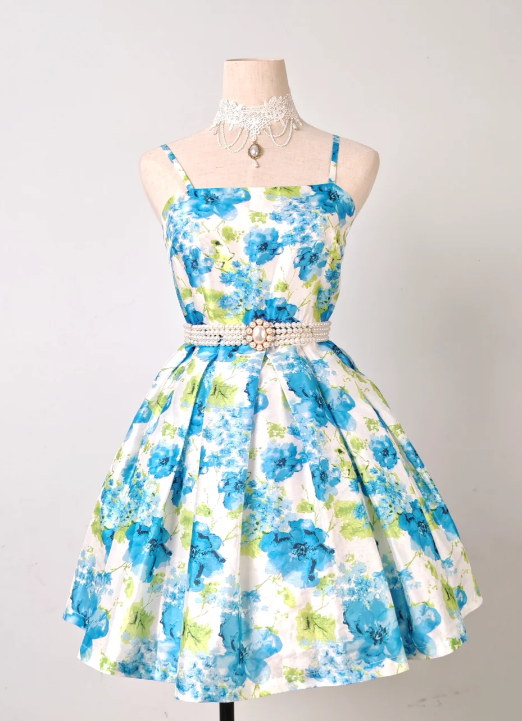 Evafashion Spaghetti Strap A-line Blue Homecoming Dress Floral Birthday Dresses HZ1024